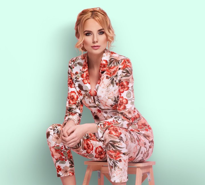 Kadın uzun kollu tek omuzdan açık iki iplik bluz ve pantolon ikili takım